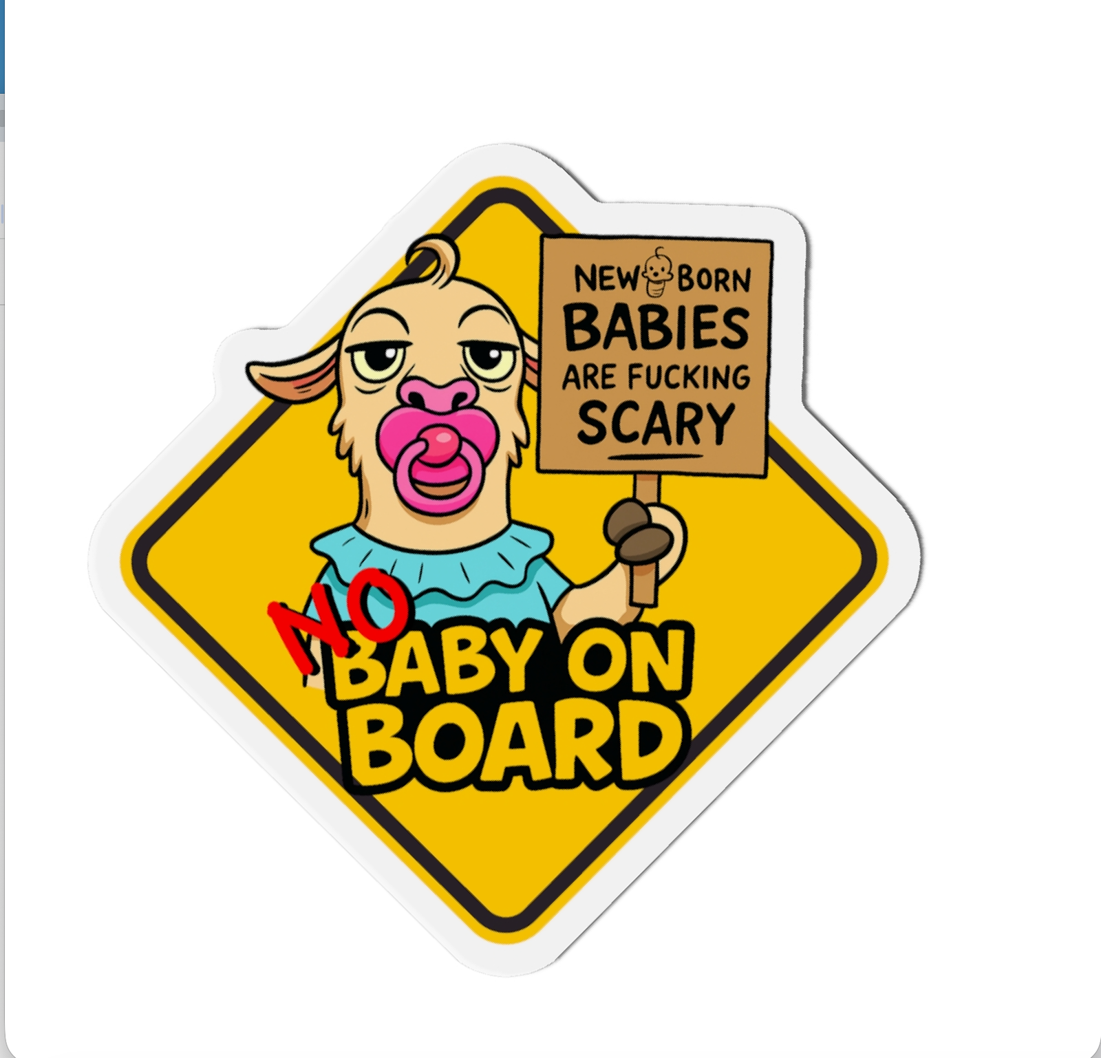 Tired of driving behind a car that has a stupid “Baby on Board” caution sign on the bumper? Well, here’s your answer! “No Baby on Board. Newborn babies are fucking scary.” This die-cut magnet will stick to anything and anywhere that magnets normally stick to… including that non-precious car bumper of yours.