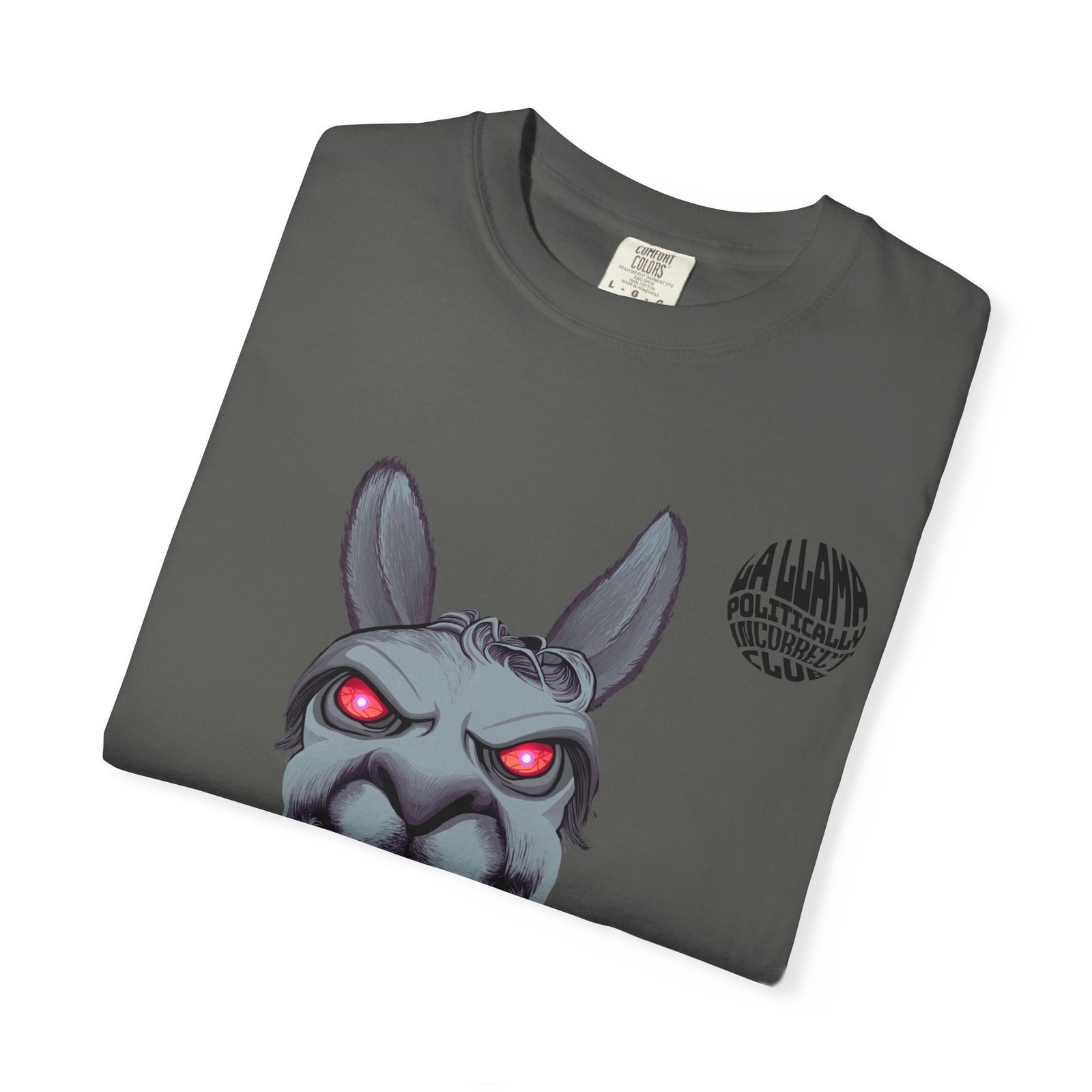 This heavyweight garment-dyed tee carries a mischievous, darkly humorous vibe. A snarling llama with glowing red eyes holds a cardboard sign reading “CANCEL ME THISSSS,” giving the shirt a punkish, irreverent attitude. The soft, garment-dyed finish and relaxed fit make it feel lived-in from day one. The subtle sewn-in label and clean tubular construction keep the silhouette simple and durable while the bold front artwork does the talking.
