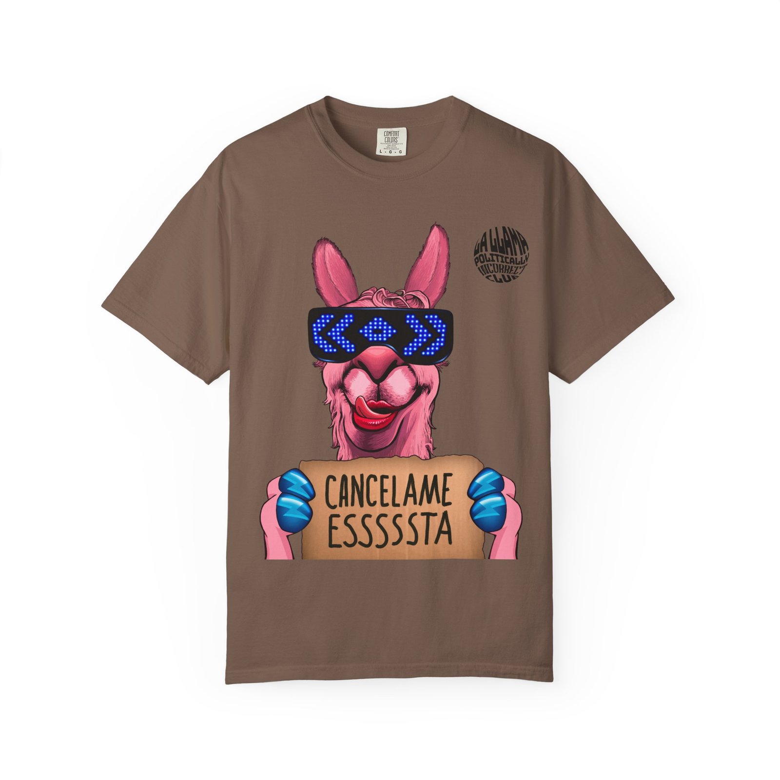 This relaxed-fit garment-dyed tee brings playful attitude and soft, lived-in comfort to everyday wear. A bold, graffiti-style llama graphic takes center stage — neon shades and pixelated LED shades give it a cheeky, streetwise vibe while the hand-lettered sign adds a dose of Latin American humor. Washed-down color and heavyweight cotton make the shirt feel broken-in from day one.