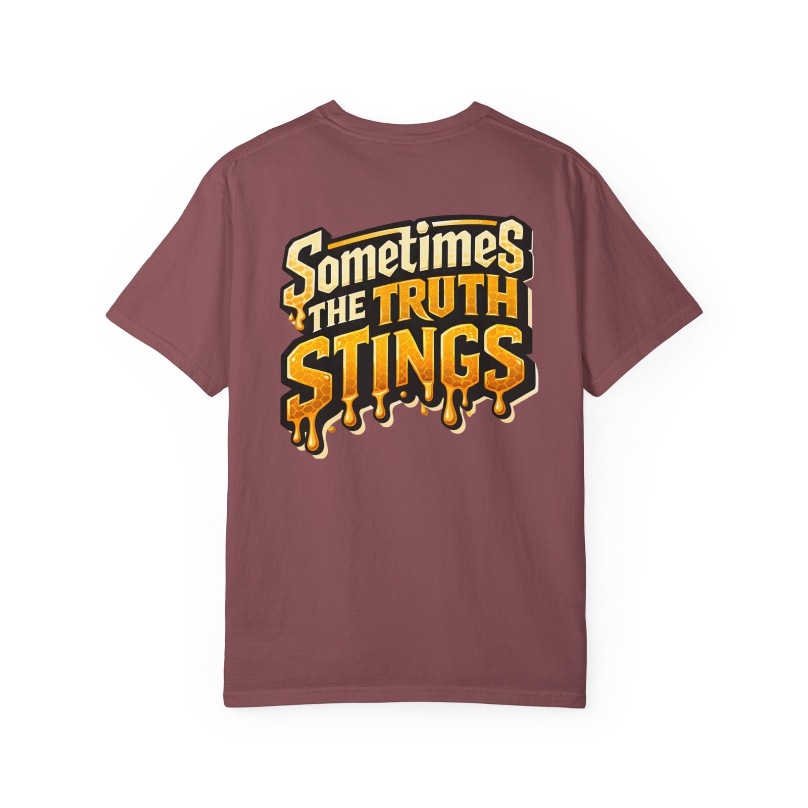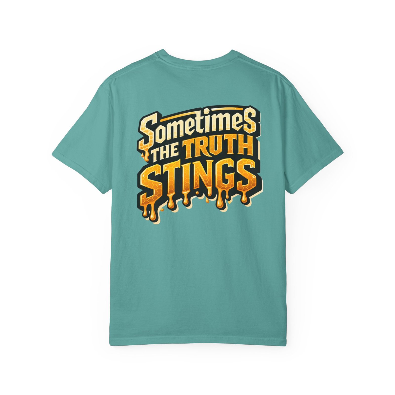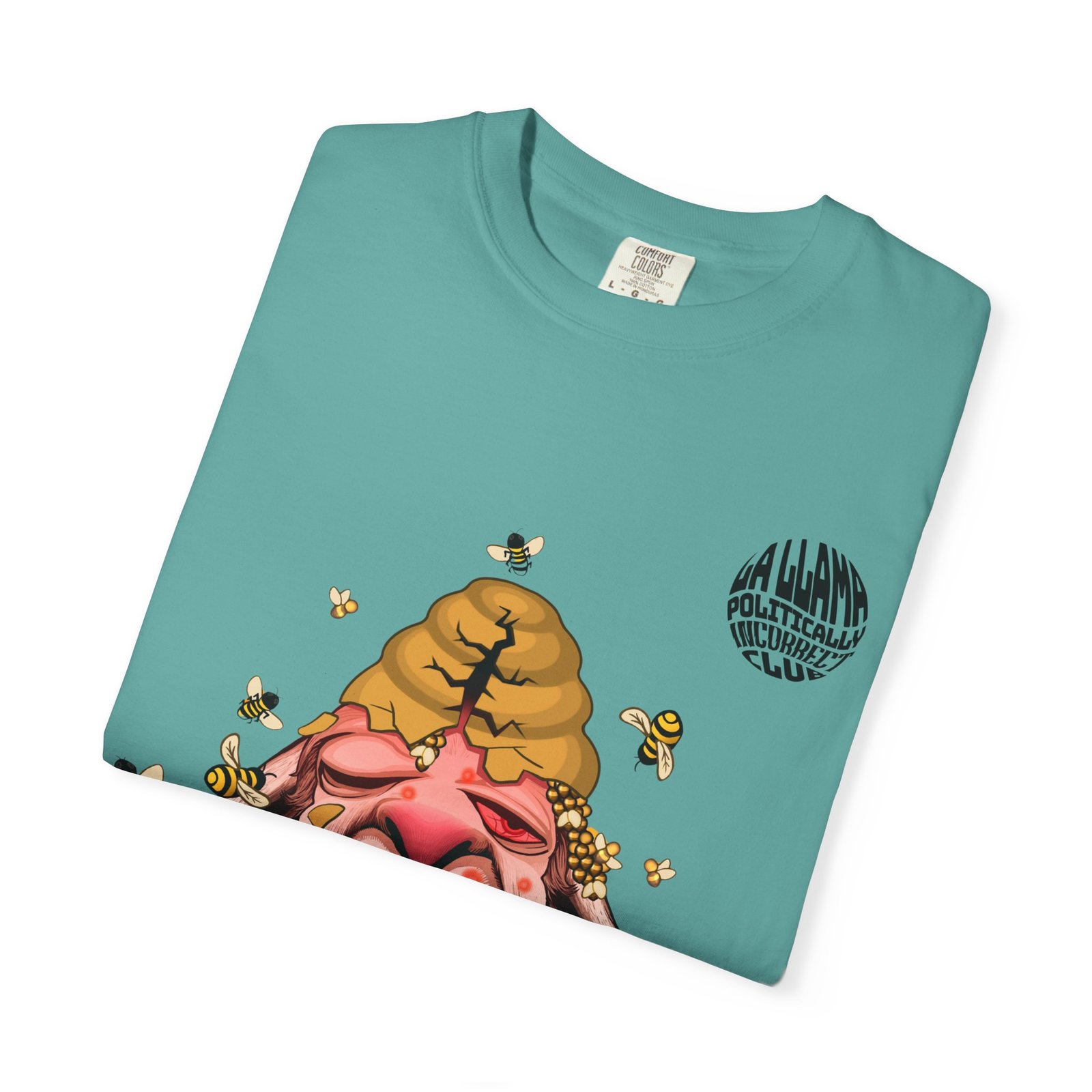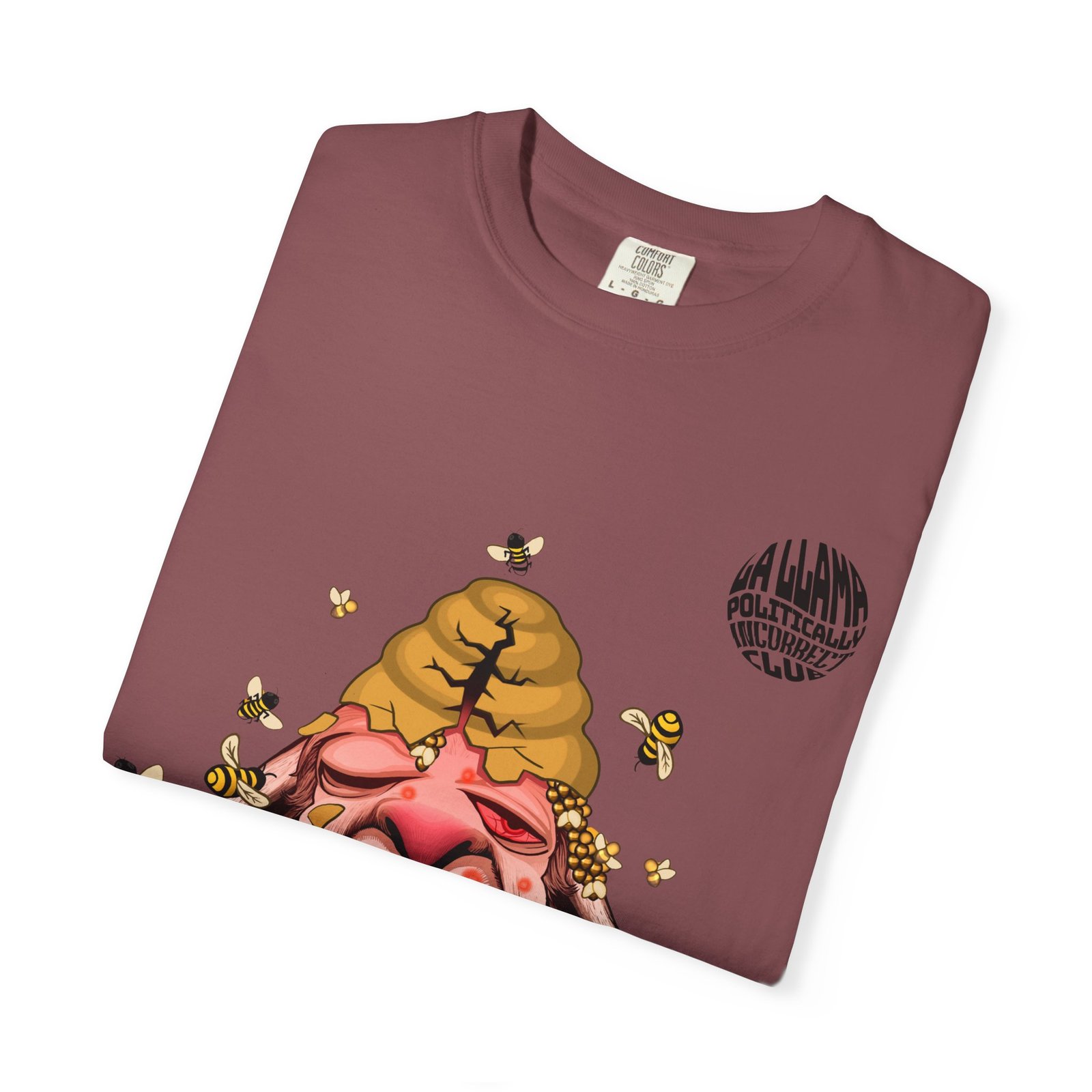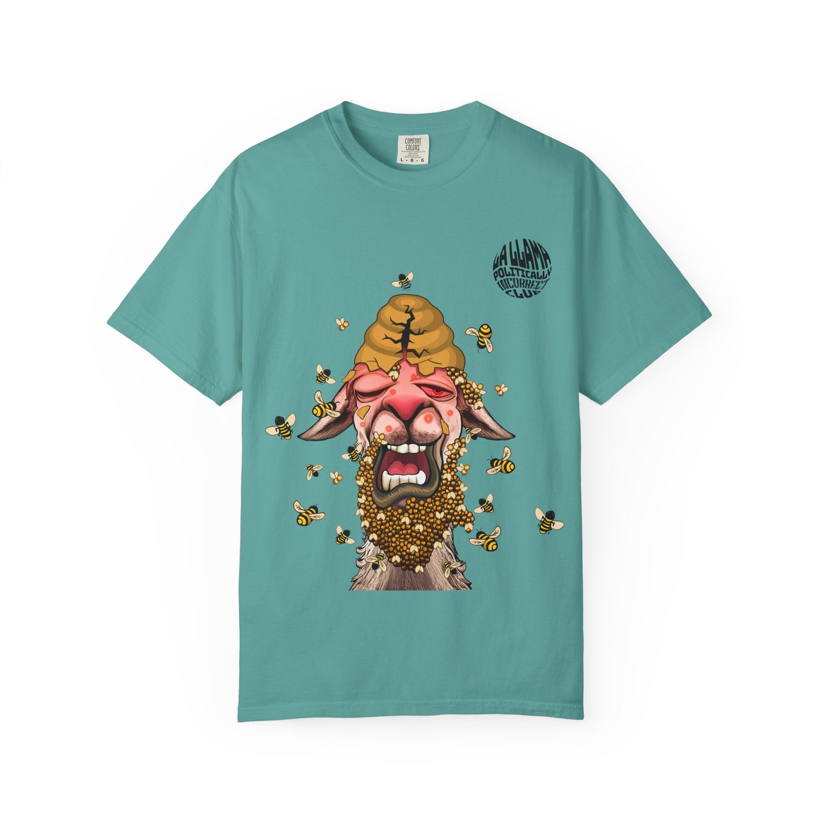 A heavyweight, garment-dyed tee that wears in like an old favorite and carries a bold attitude. The front shows a surreal, bee-filled llama — a honeycomb helmet and roaring face — while the back sports hand-lettered, dripping text: “Sometimes the Truth Stings.” It’s built for steady wear: soft after-dye texture, relaxed cut, and sturdy double-needle seams so the artwork feels lived-in, not precious.