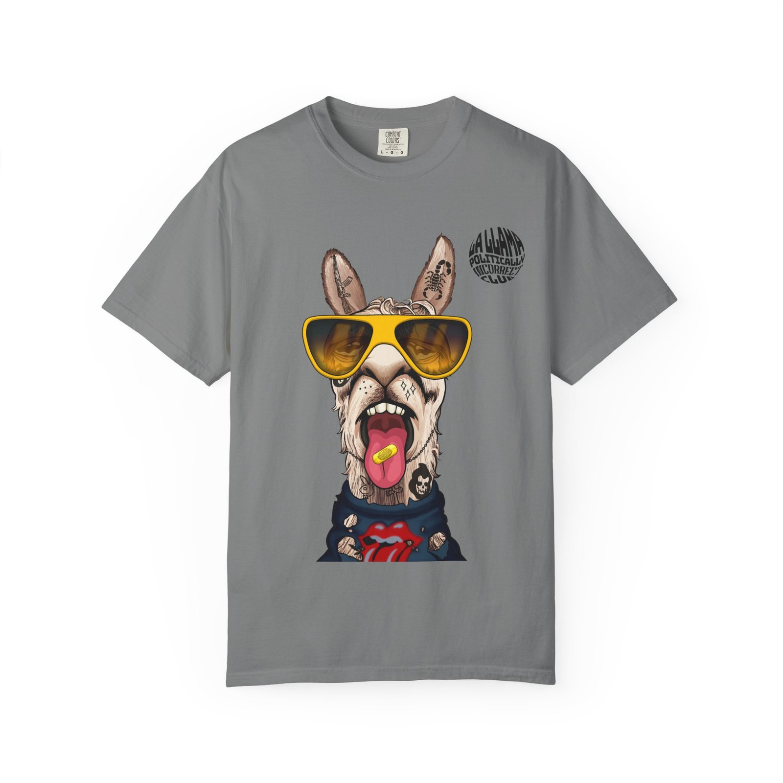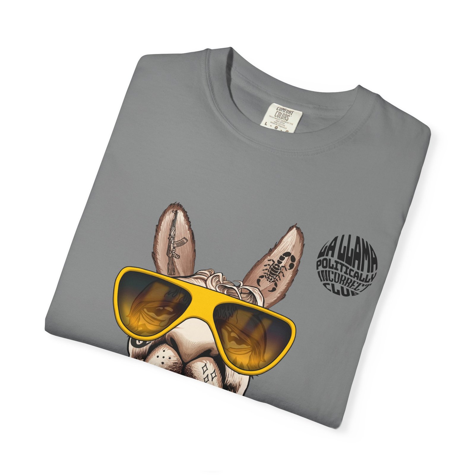 This heavyweight, garment-dyed tee brings laid-back attitude and bold art together. The relaxed fit and soft, washed-in color create an easy-wearing canvas for a punk‑playful llama wearing oversized sunglasses on the front and a clever back print that reads “SIDE EFFECTS MAY INCLUDE FREE THOUGHT.” It feels lived-in from day one — the tube-knit construction and double-needle stitching add durable, no-fuss wear while the pre-shrunk, ring-spun cotton keeps the tee comfortable and true to size. Wear it to make a subtle statement: thoughtful, irreverent, and quietly confident.