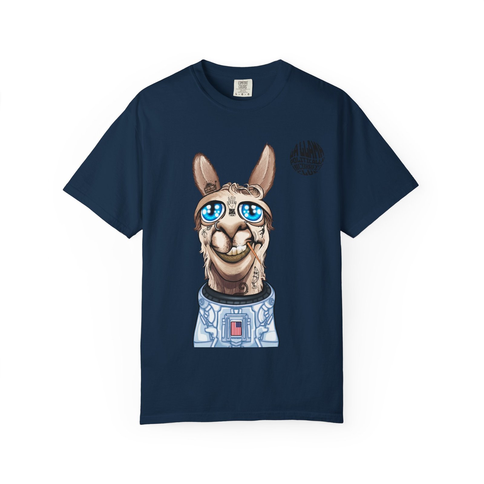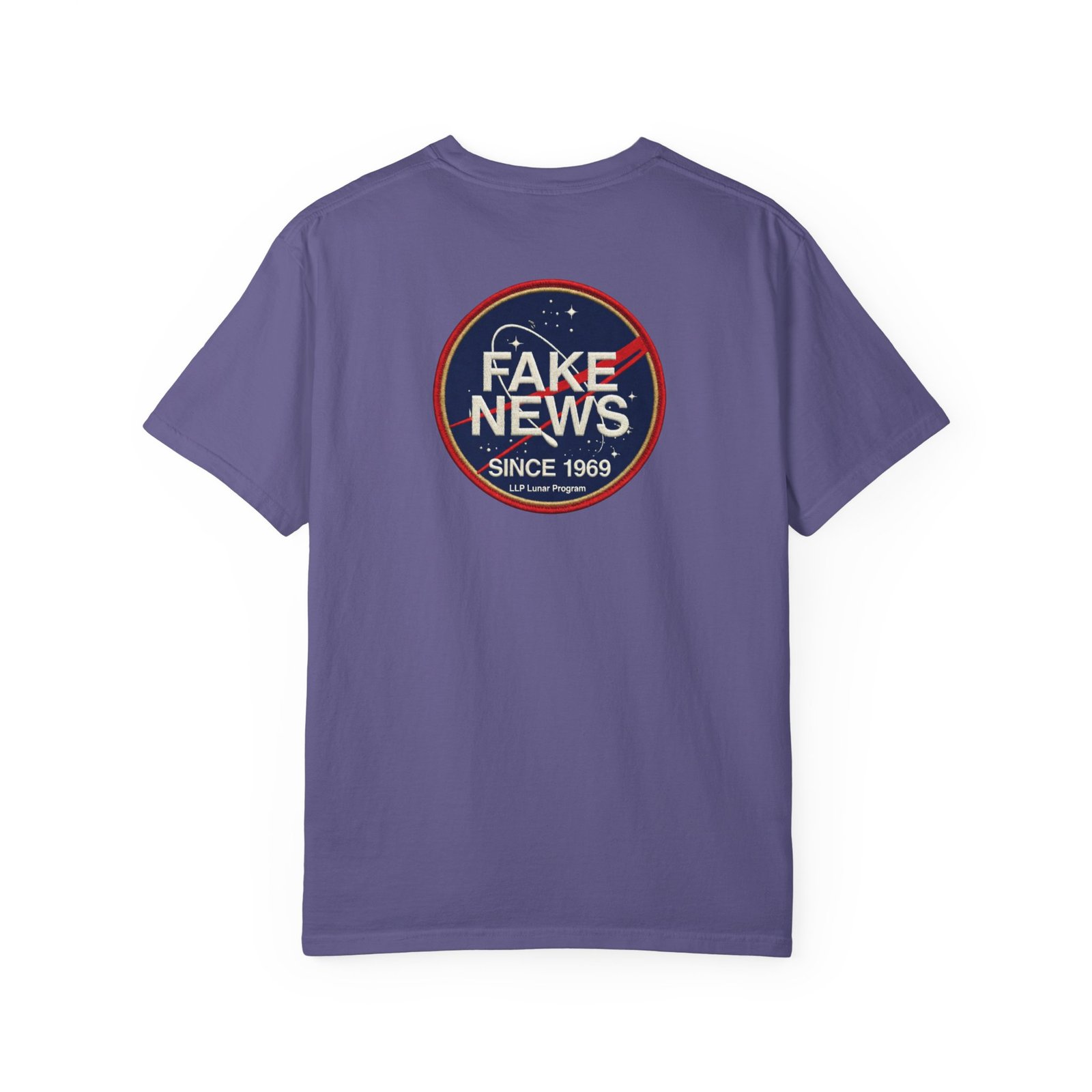 This relaxed, garment-dyed tee feels lived-in from the first wear. Front artwork shows a whimsical, llama in a retro-astronaut suit — playful and slightly irreverent. The back carries a vintage-style “FAKE NEWS SINCE 1969” mission patch, giving the shirt a satirical, space-mission vibe.