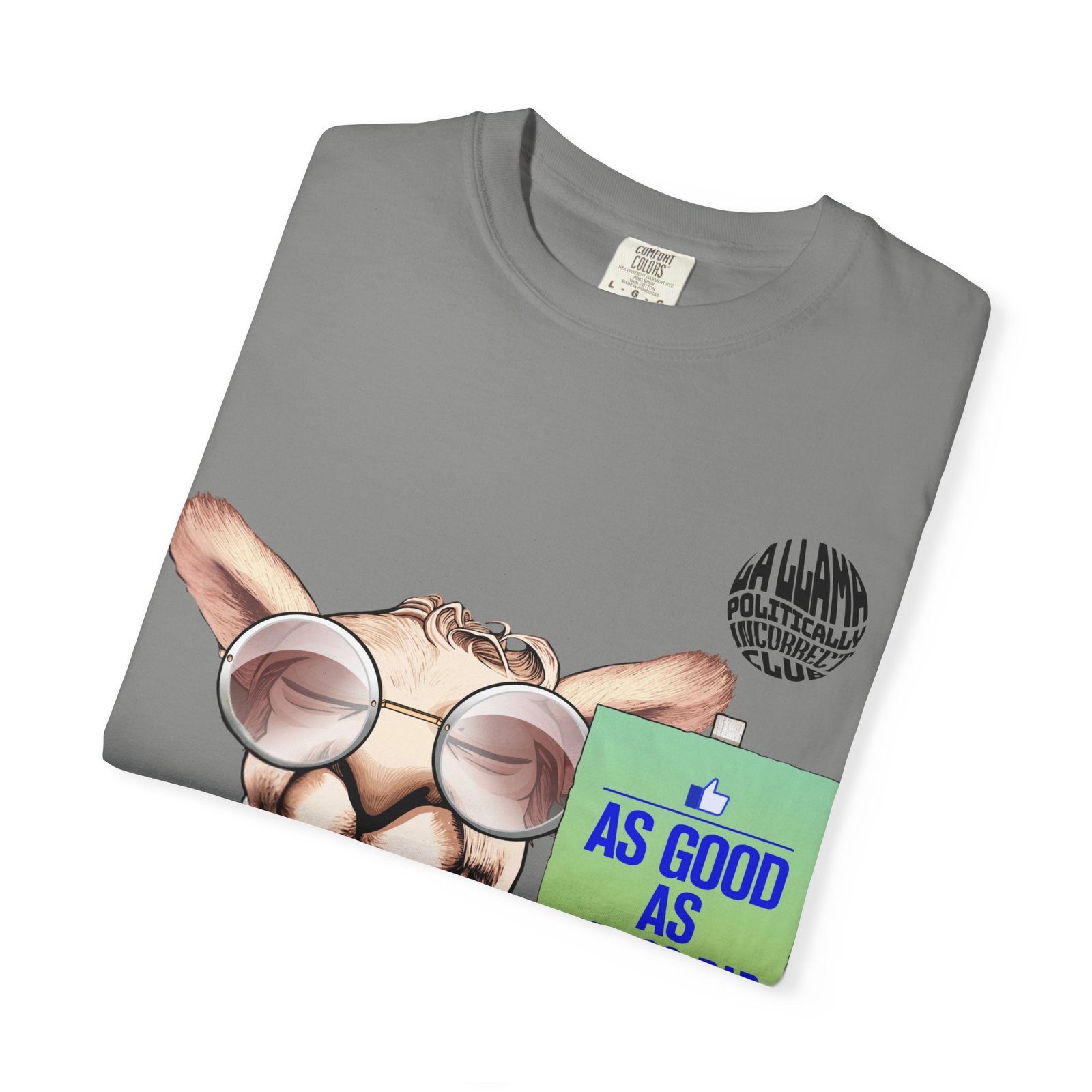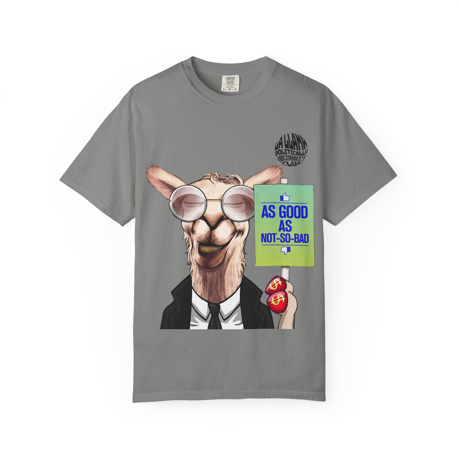 A laid-back, garment-dyed tee that feels like it’s already been part of your rotation for years. The heavyweight cotton holds shape while the post-construction dye gives the fabric a lived-in softness and subtle, slightly faded color. A quirky llama in sunglasses and a suit, holding a small sign reading “AS GOOD AS NOT-SO-BAD,” adds tongue-in-cheek charm—wear it when you want to nod to dry humor without trying too hard.
