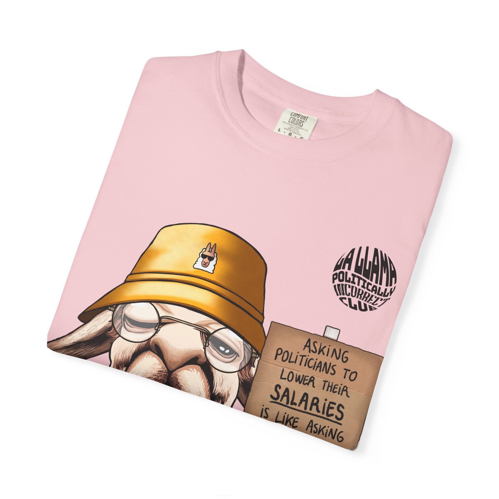 The perfect T for any election season. Soft, heavyweight cotton with a lived-in, garment-dyed finish that feels like an old favorite from the first wear. This relaxed tee carries a bold, satirical illustration of a spirited llama protester — bright colors, exaggerated expression, and a cheeky sign that sparks laughs and conversation. The design sits confidently on the chest while a compact, rounded slogan mark rests on the upper back, giving the shirt personality from every angle. It’s the kind of tee you pull on when you want to be seen and heard, whether you’re wandering city streets, heading to a rally, or meeting friends at a low-key show.